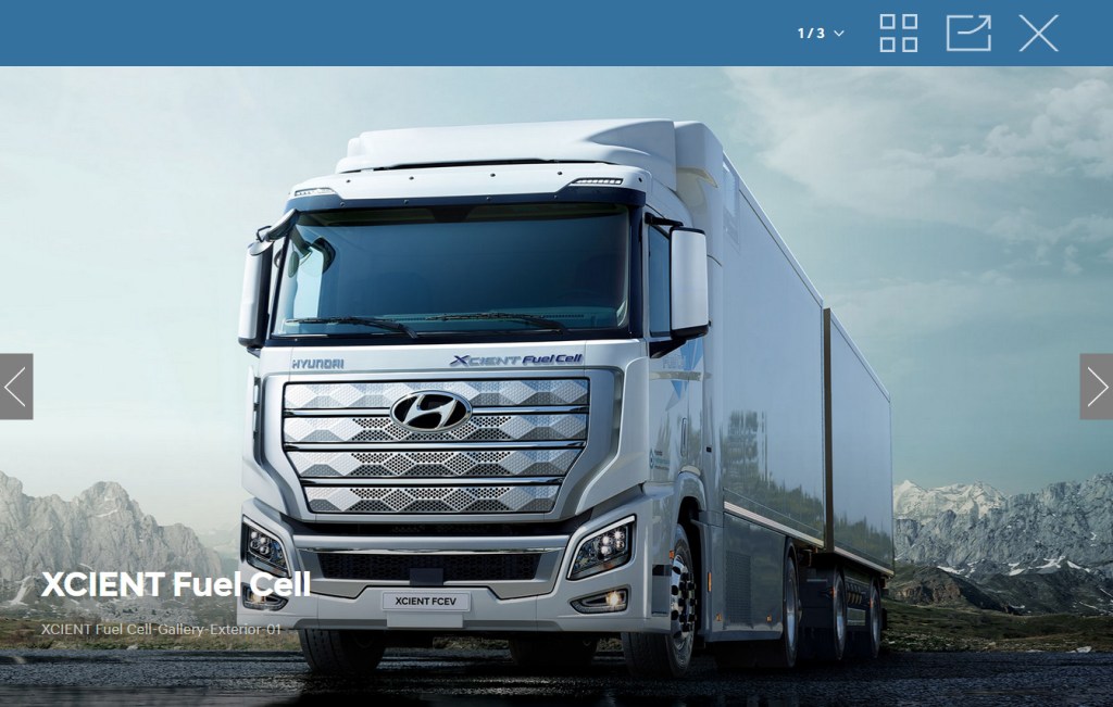 We grabbed a screenshot from Hyundai’s commercial-vehicle site to give you some perspective on the fact that this is indeed a big truck, a full Class 8 rig. Seven major trucking operations in Europe plan to add XCIENT rigs to their fleets by 2025. For the North American market, Hyundai has already unveiled its fuel cell HDC-6 NEPTUNE Class 8 concept, as it organizes a supply chain that will include hydrogen refueling stations, as the South Korean giant aims to sell 12,000 such trucks here by 2030. Hyundai also plans a new, dedicated platform for hydrogen-fueled trucks in the near future, with powered e-axles and estimate range of up to 1,000 kilometers, or about 620 miles, between refueling.