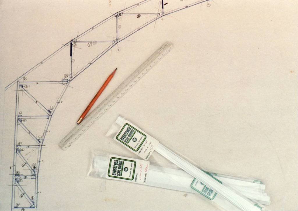 Let’s explain what was involved here. The model of the coliseum was constructed entirely from scratch, primarily from plywood, with fold-down sides and a slide-up rear door for photo access. The skylights and all interior lighting are fully functional, the latter originally illuminated, pre-LED, with grain-of-wheat incandescent bulbs. There are working colored-light wheels, just like the car shows used to have, powered by electric motors underneath the coliseum floor. See the interior roof bracing? It’s all scratchbuilt, using scaled-down plans of the actual building that Ken created, the structures made from hand-cut, -shaped and -glued lengths of styrene beams, tubes and sheets from Evergreen Scale Models, a company everybody in this world knows intimately, which donated materials to the Oakland Coliseum project.