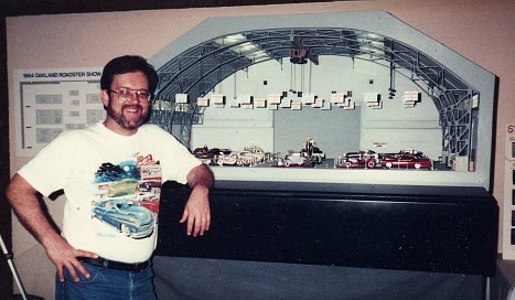 What you see above is the result of a museum effort to recreate the AMBR vibe, all of it, in 1/25th scale, including its longtime home. The guy in the T-shirt is Ken Hamilton, who constructed the scale replica behind him, an actual, proportionally accurate model of the Oakland Coliseum, which hosted the roadster show for decades before it moved to its current home at the Los Angeles County Fairplex in Pomona. We’ll get to the model, and how it happened, in a minute. Ken is an extremely serious and gifted scale modeler, and likely the only person in history to win both a Gold Award for excellence from the National Model Railroad Association and a class award at the GSL International Scale Vehicle Championship, widely considered the world’s most prestigious and competitive model car competition. Talent-wise, he’s got both feet in some very deep water. I found out that like me at the time, Ken lived in South Jersey, so I wrote a newspaper feature on the lighthearted car-themed dioramas he created, which I’d seen in Scale Auto Enthusiast. That story helped get me hired at Hemmings Motor News. Today, Ken lives in Charleston, South Carolina, where his work is curated and displayed at Lowcountry Artists Gallery, where as a resident artist, he creates 3D studies that make extensive use of traditional modeling and detailing skills that he possesses copiously.