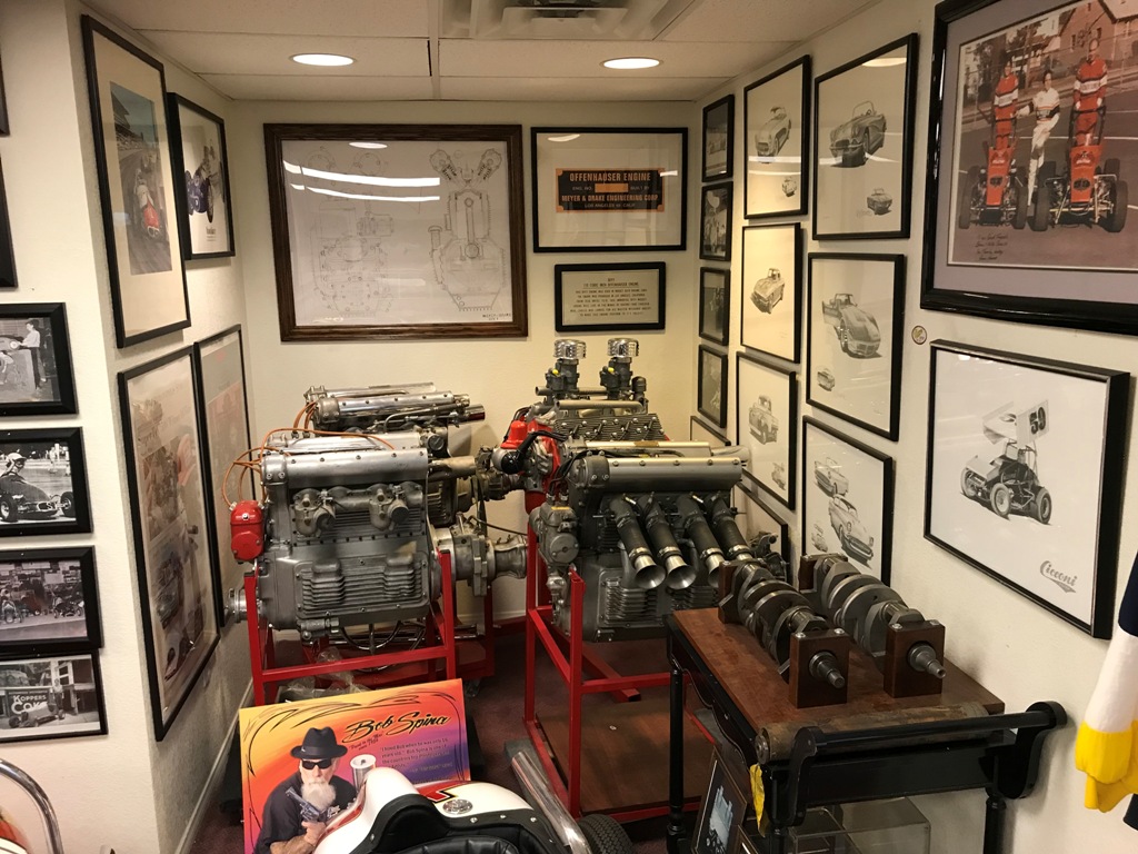 In this alcove are several Midget engines, including a couple of Offys and a downsized Ford V8-60 flathead, One of the crankshafts on the table has a special history: The family patriarch, Mike Caruso Sr., lightened it by slicing away some of its counterweights before Schindler hustled the Kurtis to quick time while qualifying for a race inside the Los Angeles Coliseum in 1946. Schindler won 53 major Midget meets aboard the Caruso car in 1947, then backed it up with another 53 wins the following year. Counting in his prewar victories, the legendary Schindler ultimately owned an estimated 200 Midget triumphs with the Caruso family, an astonishing record.