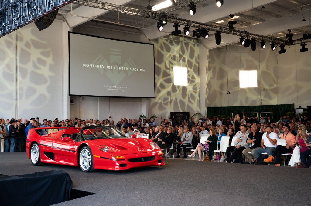 As the photo shows, Broad Arrow presented an intimate setting for its sale, which included this 1995 Ferrari F50, which hammered at a world record price of $5.175 million. Just edging it out for top sale of the event was another Ferrari, a gorgeous 250 GT SWB Berlinetta “Tour de France” from 1957, which rolled out of the hangar for an even $5.5 million. The lot we were watching was the one spotlighted in this space, the 1964 Aston Martin DB5 from the estate of Sir Sean Connery, which brought $2,425,000 and included a personal drive with Sir Jackie Stewart. All together, the Monterey sale rang up $55.3 million in sales, with a 88 percent sell-through rate of the 93 lots offered. Broad Arrow now moves toward its sale liquidated the famed upstate New York collection of Jim Taylor before taking on another live sale this November in West Palm Beach. Broad Arrow has also been named as the official auction house at The Amelia, another Hagerty holding, beginning next year.