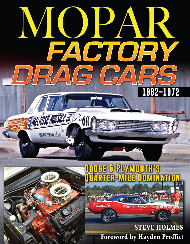 In 176 softbound pages, author Steve Holmes takes the reader on a year-by-year progression of Chrysler’s famed presence in big-time doorslammer drag racing, tracing the tale from early Max Wedge action in Super Stock to the early Funny Car years, the coming of the Hemi and altered wheelbases, and the dawn of Pro Stock. The notorious tale of how the NHRA scissored away poundage from those early Pro Stocks to help hook an anchor to Mother Mopar is told in full here. The list of Chrysler drag luminaries in the volume runs from the original Ramchargers all the way through the original Motown Missile and then some. You simply can’t have a complete drag racing library without this. Order now, and you get a special introductory price of $29.56.